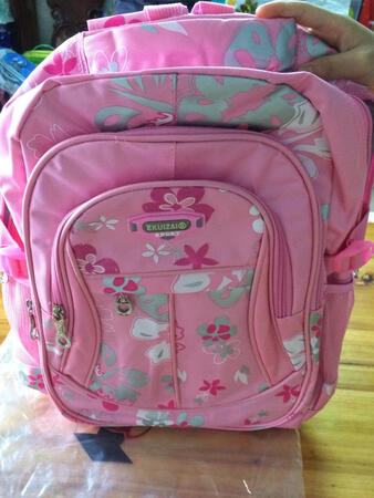 买来给幼儿园小朋友用的,因为老师说要双层书包,这样外面一层可以放替换下来的脏衣服,原来的书包小小的,买了这个,发现这个书包容量很大,而且粉粉的很漂亮,也比较轻便。现在每周拿枕头回来的时候都可以直接塞进去了哈哈,超级方便的。有点淡淡的味道,洗过晾一下好像没有了