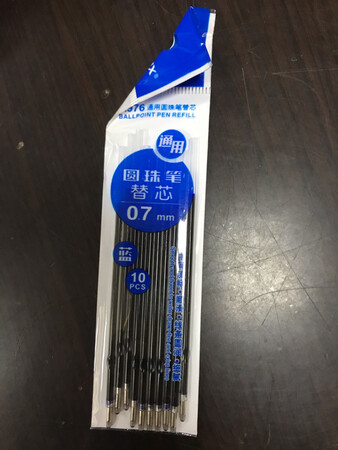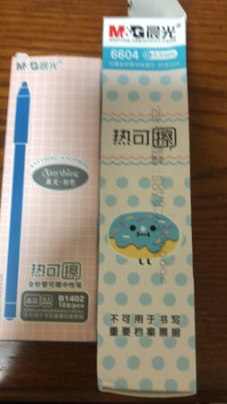 没注意看这个好像是热可擦,比自带的笔芯颜色要浅一点。上面是此款笔芯,下面是晨光新流行晶蓝自带的笔芯。