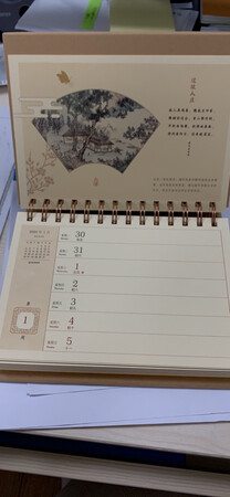 到手后很漂亮,淡黄色的纸张,厚厚的,手感很好,古香古色,很喜欢。我喜欢用周历,周历形式对一周的安排和规划更合理,可以直接知道这一周要做什么。每页内容排版也挺合理,和图片看起来一样,感觉实物还更漂亮些。快递也很快,第二天到货,送货上门。