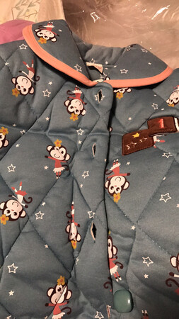 很可爱的猴子们。面料里料纯棉手感很好。中间夹层是聚酯纤维的。在室内穿足够暖呵