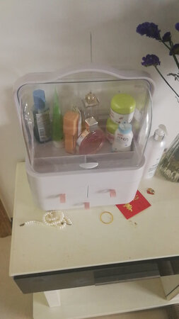 容量大小:容量超大,能放好多,比较大瓶的喷雾也能放得下,还有两层小抽屉,抽屉不算很高,只能放点零散的东西。 厚薄程度:塑料材质不错,有一定厚度,没有异味,直接搽搽就能直接用了。