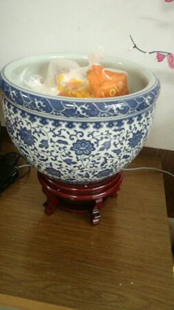 坛子挺厚实的,还送了一个矮矮的底座(如图2),本来是买来养金鱼和睡莲,担心自己养不好,就用来装家里的干货了。
