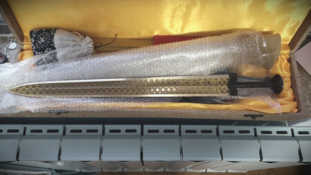 沉甸甸的一把剑,还是很有分量的!这把剑做工也很精细,是一份很不错的工艺品(忽略后面凌乱的背景)